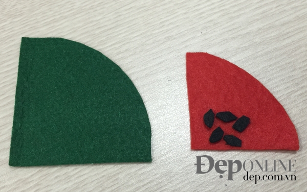 - Cắt vải dạ thành hình một phần tư hình tròn, một mảnh to, một mảnh nhỏ. Cắt thêm các hạt dưa hấu màu đen, hình cuống dâu tây, múi cam như các hình ở dưới.